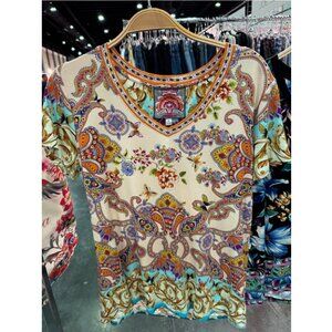 Johnny Was Janie Favorite Scroll Tee Short Sleeve V Neck Shirt White Gold Top NEW