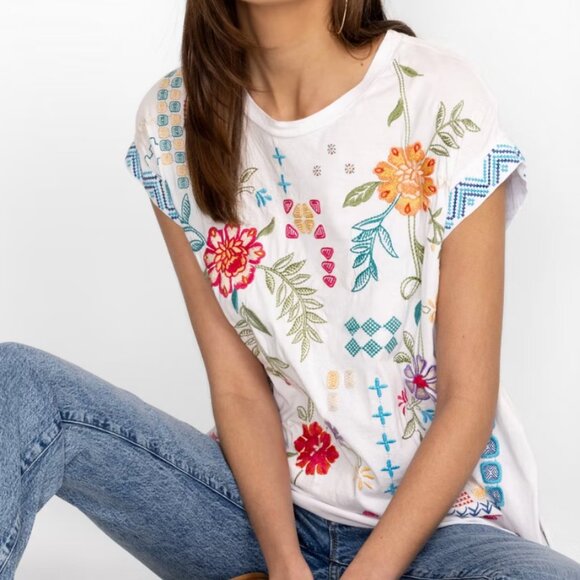 #JohnnyWas #BohoTop #EmbroideredTop #KatieTee #BohoChic #FestivalStyle #CasualStyle #SummerTop #ResortWear #EmbroideredClothing #SmallSize #JWLA #DesignerTop #FloralTop #ChicComfort