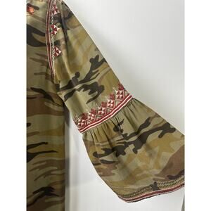 The Johnny Was L Floral Embroidered Camo Mini Dress in green is a stylish and lightweight boho piece made from 100% silk. Featuring a V-neck, 3/4 puff sleeves, and a pullover closure, this dress is perfect for casual occasions in the summer, fall, or spring. The floral embroidery adds a unique touch to the shirt dress, making it a standout piece in any wardrobe. Made in China, this dress is a must-have for women who appreciate bohemian fashion with a whimsical flair.