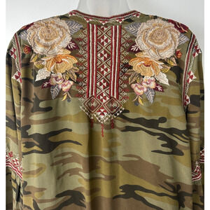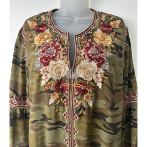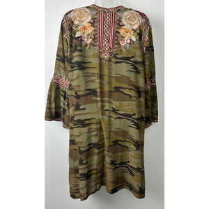 Johnny Was L Floral Embroidered Camo Mini Dress Green 100% Silk Womens Boho B7