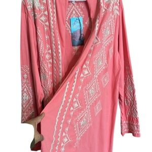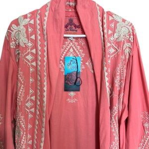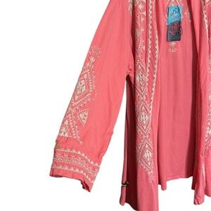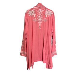 Johnny Was LA Elegant coral cardigan with intricate embroidery. Perfect for layering.coral color, long sleeves size 2X