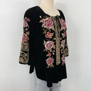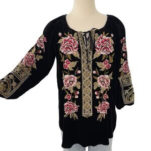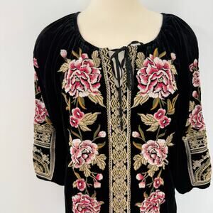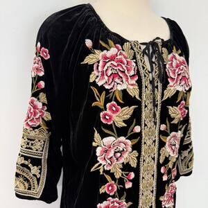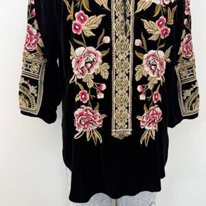 Johnny Was Leith Velvet Embroidered Top Tunic Blouse Black Floral S
