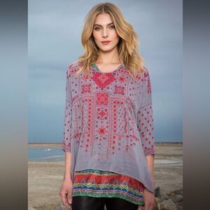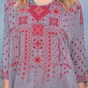 Johnny Was Light Gray/Lilac Embroidered in Red Tunic Top. Size XS. Semi sheer fabric with beautiful intricate floral embroidery. A bit oversized. Excellent preowned condition - just needs a steam/press. Ships from a smoke and pet free home.