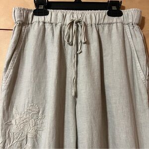Tags: Linen. Embroidery. Floral. Boho. Bohemian. Lagenlook. Cottagecore. Prairiecore. Spring. Summer. Travel. Vacation. Resort. Tropical. Embroidered. Jogger. Pull-On. Drawstring. Minimalist. Neutral.