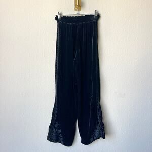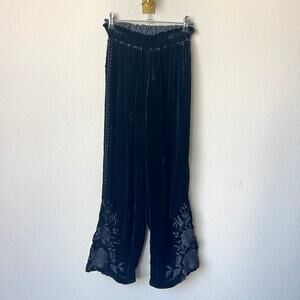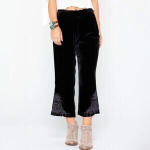 JW Johnny Was Los Angeles black velvet embroidered cropped pants. Featuring tonal floral embroidery at the hem and subtle lace trim along the sides. Crafted from a rich rayon-silk blend with an elastic waistband for comfort and a relaxed yet elevated bohemian vibe. Size medium - waist stretches comfortably to 15"; 12" rise; 24" inseam.