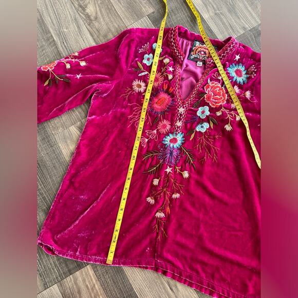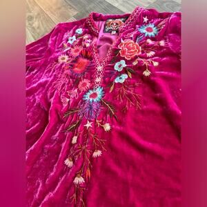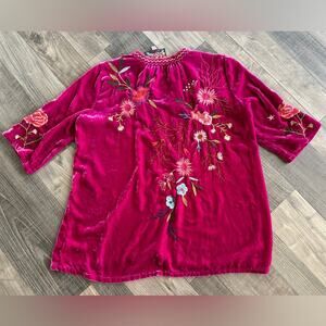 Women size XS oversized v neck velvet blouse with embroidery throughout front and back. In great shape.