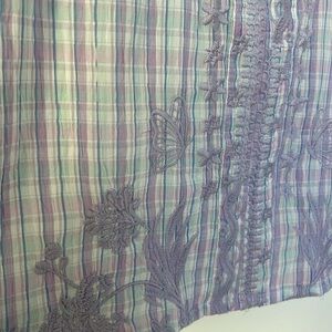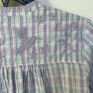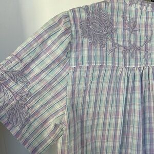 Johnny Was Malo Puff Sleeve Blouse Lilac Embroidered Plaid Bird Floral Small