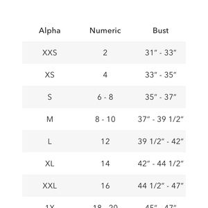J.W.Sizing Chart- XL fits size 14, 42-44 Bust