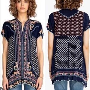 JOHNNY WAS Moji Blue Night Floral Embroidered Handkerchief Tunic Blouse Shirt
