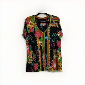 Johnny Was Multicolor Floral Andra V Neck Swing Tee Tunic Jersey T Shirt Sz M