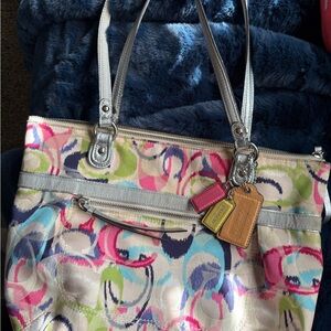 Vibrant multicolor sweater with intricate patterns. Features red, blue, and cream tones. Open front design. Long sleeves. Fits like an XL