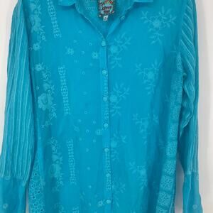 Johnny Was NYX Button Down Embroidered Eyelet Shirt Light Blue Size Medium