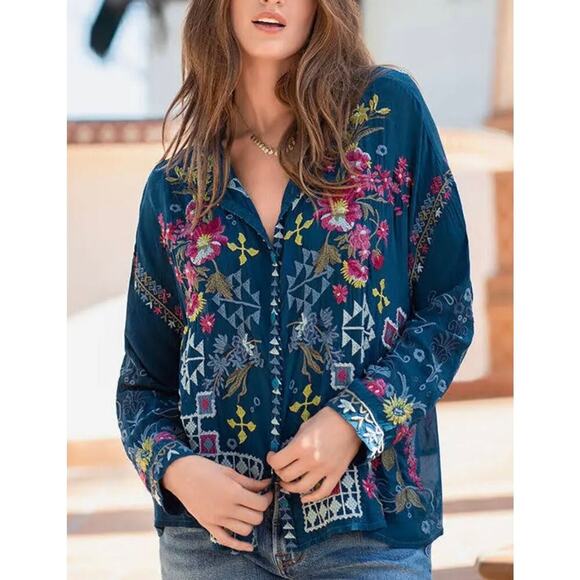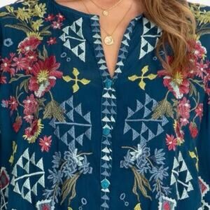 Johnny Was Navy Floral Embroidered Top