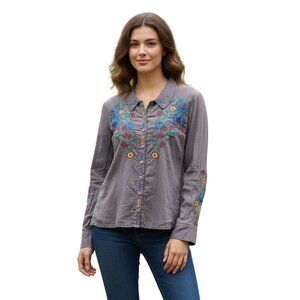 This Johnny Was blouse features intricate floral embroidery on a taupe button-down design, offering a unique and stunning look. Perfect for casual or semi-formal occasions.