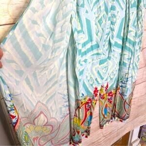 Item in Excellent Preowned Condition. Split Front, Partial Stretch waist (in back), Arabic Print, Lightweight, SMALL INK FLAW IN MATERIAL - SEE PHOTO, 100% Viscose. Measurements taken laying flat: