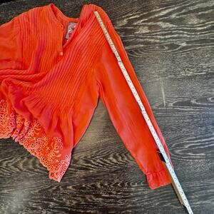 johnny was top, embroidered blouse, boho tunic, red long sleeve blouse, womens size large, festival top, cutwork hem, artisan blouse, peasant tunic, cottagecore blouse