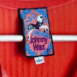 Fabric content not shown. Johnny Was typically uses rayon/viscose blends. Recommend gentle wash or dry clean.