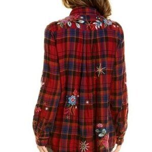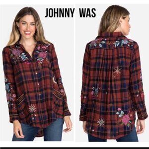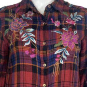 Johnny Was "Cordelia" plaid shirt with embroidery and pockets Spread collar; button front long sleeves; button cuffs Relaxed silhouette Cotton. Worn once,. Approx measurements Pit to Pit: 19 inches. Length: 30 inches.