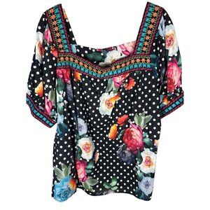 This top features a striking black base adorned with pink floral embellishments, offering a boxy silhouette for a relaxed fit. The blouse is designed with short sleeves and a decorative neckline, making it a standout piece for any occasion. Johnny Was Polkalona Blouse.