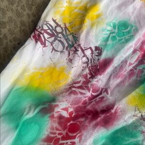 Such a gorgeous & unique top from Johnny Was. Made of 100% Cupra rayon, it features a crochet top with a painted pattern on the main part of the bodice. Has a handkerchief/tunic hem. Size S (but is oversized). Has one tear under the armpit that was repaired by a professional tailor (shown in the last photo). This will be a standout piece!