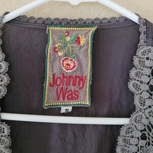 Preowned in great condition, no flaws, Johnny Was Rayon Pewter Embroidered Lace Eyelet Kimono Boho Tunic Top