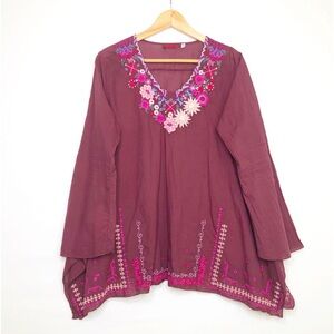 Johnny Was Red wish stitch, floral embroidered long sleeve tunic top
