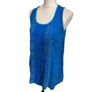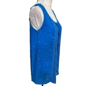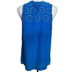 Johnny Was Royal Blue Eyelet Pleated Sleeveless Boho Cottage core Blouse - XS