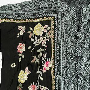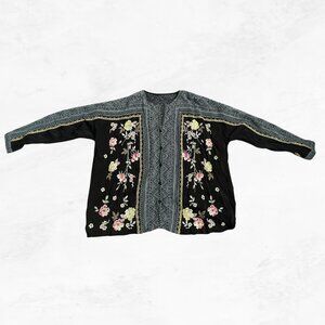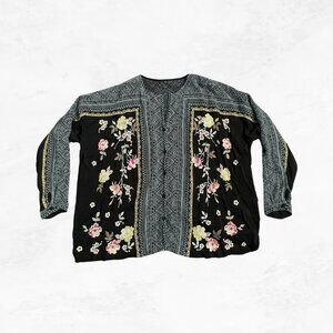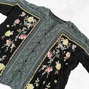 + Black button-down blouse with multicolor floral embroidery and patterned trim