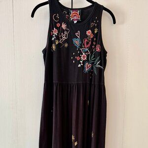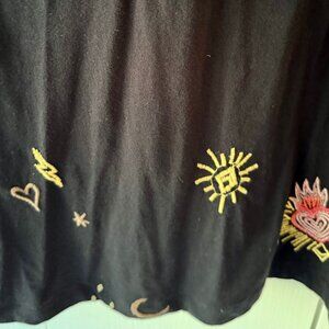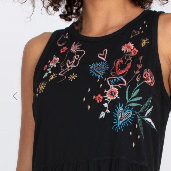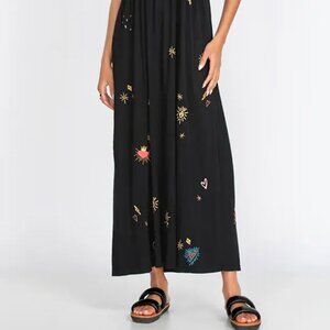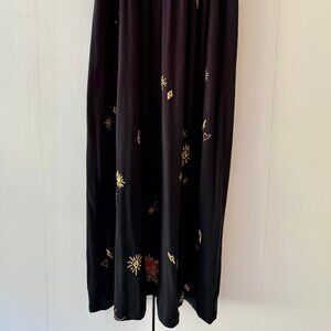 High crew neck, incut arms, and loose fit high waist attached to a flowing skirt