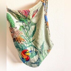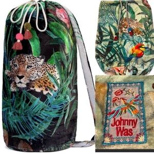 NWOT Johnny Was "Jungle Cozy" Blanket Bag Backpack. This gorgeous bag features drawstring tassel closure, soft fabric, vibrant colorful jungle print, and designed for blanket. Blanket not included just blanket bag.