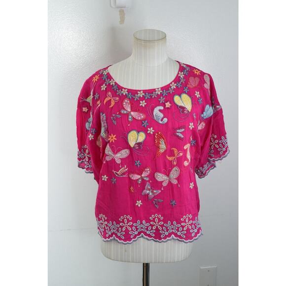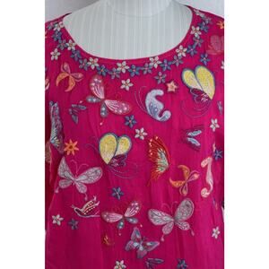 Johnny Was Shirt Womens XXS Pink Embroidered Butterfly Floral Boho Top