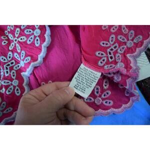 Vibrant pink with multicolor embroidered butterflies, flowers, and scalloped trim