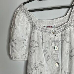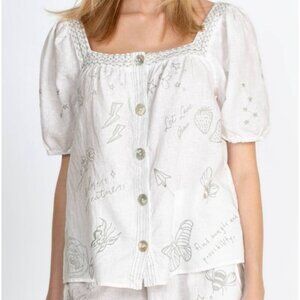 This Johnny Was Sovanna Wander Top is a white and gray short sleeve with a square neck. It features delicate embroidery and mother of pearl buttons, perfect for boho and festival style.