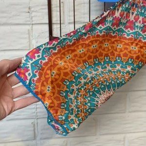 Gorgeous and rare! Johnny Was silk blouse size XS in excellent used condition. This is a peasant style blouse with loose sleeves and the loveliest ruffled details on front and back. The edges of the sleeves and the hemline of the blouse are trimmed in delicate turquoise crochet trim and the ruffles are edged with turquoise thread. There are also two delicate cascade ruffles that hang loose in the front.