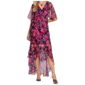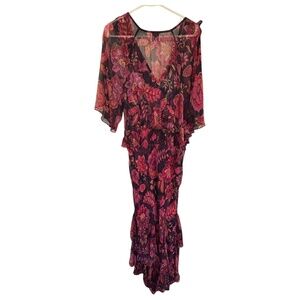 Johnny Was Silk Luxee Ruffle Maxi Dress Purple & Red High Low Bohemian Size XL
