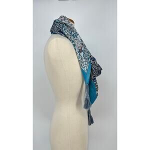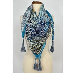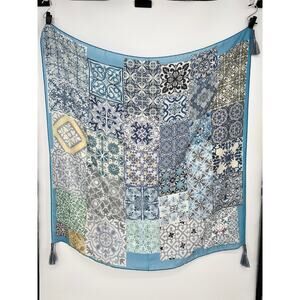 Johnny Was Silk Tassel Scarf Patchwork Mixed Print Square Wrap Blue Gray Green