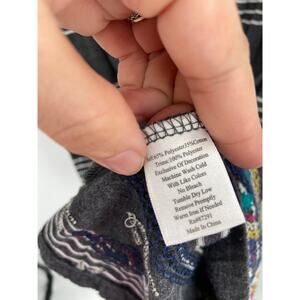 This cotton blend dress from Johnny Was features horizontal stripes and is embellished with multicolor embroidery at the scoop neckline and hem. Size: Medium Color: Heathered Gray White stripes Pockets Embroidered Elastic waist Scoop neck Pull-over style 3/4 length sleeves Polyester, cotton blend Excellent condition
