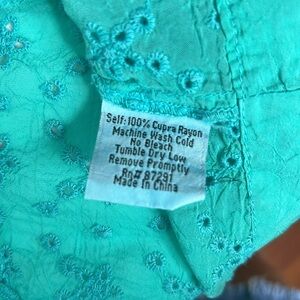 Turquoise kimono/cardigan that features eyelet trim and embroidered front