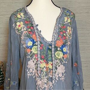 Johnny Was Taifa Blouse Blue Grey Embroidered Floral Peasant V-Neck Boho Medium