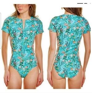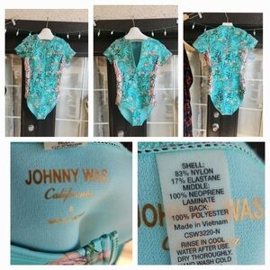 Johnny Was Taina Neoprene One Piece Swimsuit Bathing Suit Bright Turquoise Aqua Blue Green Floral Printed_ UPF50+ High neck Short sleeve one piece Stretch for maximum range of movement Retains shape after continuous wear Fade and pilling resistant Front zipper Tropical Animal Bird Beach Vacation Resort