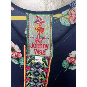 This Johnny Was dress in size XS features a multicolor floral embroidered design in an A-line style. It is knee-length with a sleeveless cut and a scoop neckline, perfect for casual summer occasions. Made from a blend of Cupra Rayon, Cotton, and Polyester, the fabric is georgette and machine washable. Manufactured in China, this dress is pre-owned.