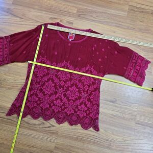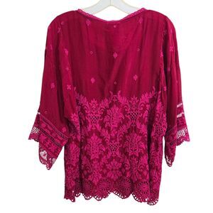 Johnny Was Tasho Georgette Top PM Petite M Dolman Dark Pink/Red Eyelet Lace