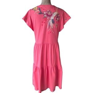 Johnny Was Tiered Embroidered Cotton Midi Dress Boho Artsy Coral Pink Medium