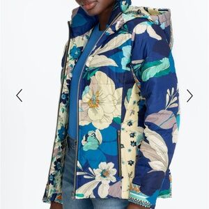Johnny Was beautiful reversible jacket. This modern jacket creates a flattering and structured fit using different vertical design elements, while the large floral motifs introduce pops of color. The hood and zipper closure make this jacket both versatile and sporty. Create a stylish and sporty look by pairing this lightweight jacket with some leggings and white sneakers.