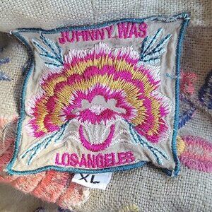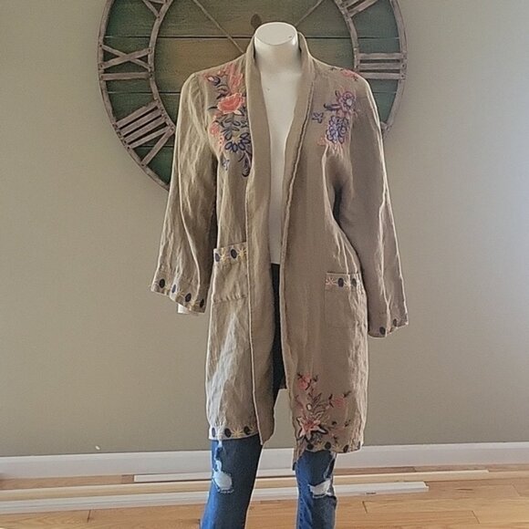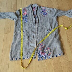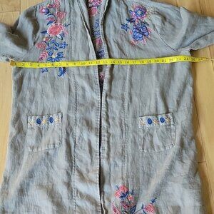 Johnny Was Tiwa Heavy Linen open front shawl collar embroidered coat with front pockets used has signs of wear pictures taken of aprox measurements