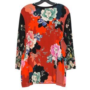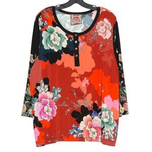 Johnny Was Top 3/4 Sleeve Floral Henley Boho Cottage Maximalist Red Black Large