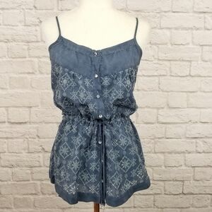 Johnny Was top in a medium blue. It resembles a chambray blue color. It is an eyelet lace top with thin spaghetti straps, buttons on the front and ties at the waist. The back has a solid panel detail and also on the front on the top part and at the hem.
