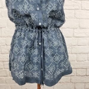 Johnny Was Top Blue Eyelet Thin Straps Tie Waist Button Front Rayon Size XS