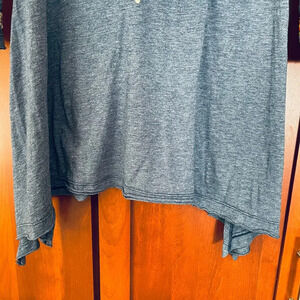 Features three quarter sleeves, a split hem, and a scoop neck.