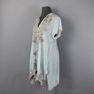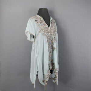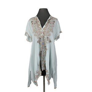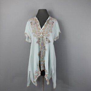 Johnny Was Top Sz M Aqua Blue Multi Color Embroidered Sheer 100% Rayon Poly Top